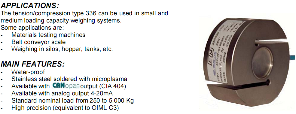 Tension/compression load cell TYPE 336 can be used in small and medium loading capacity weighing systems.