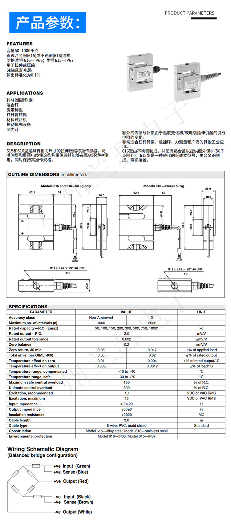 美國Tedea 616-500kg稱重傳感器產品參數(shù):
