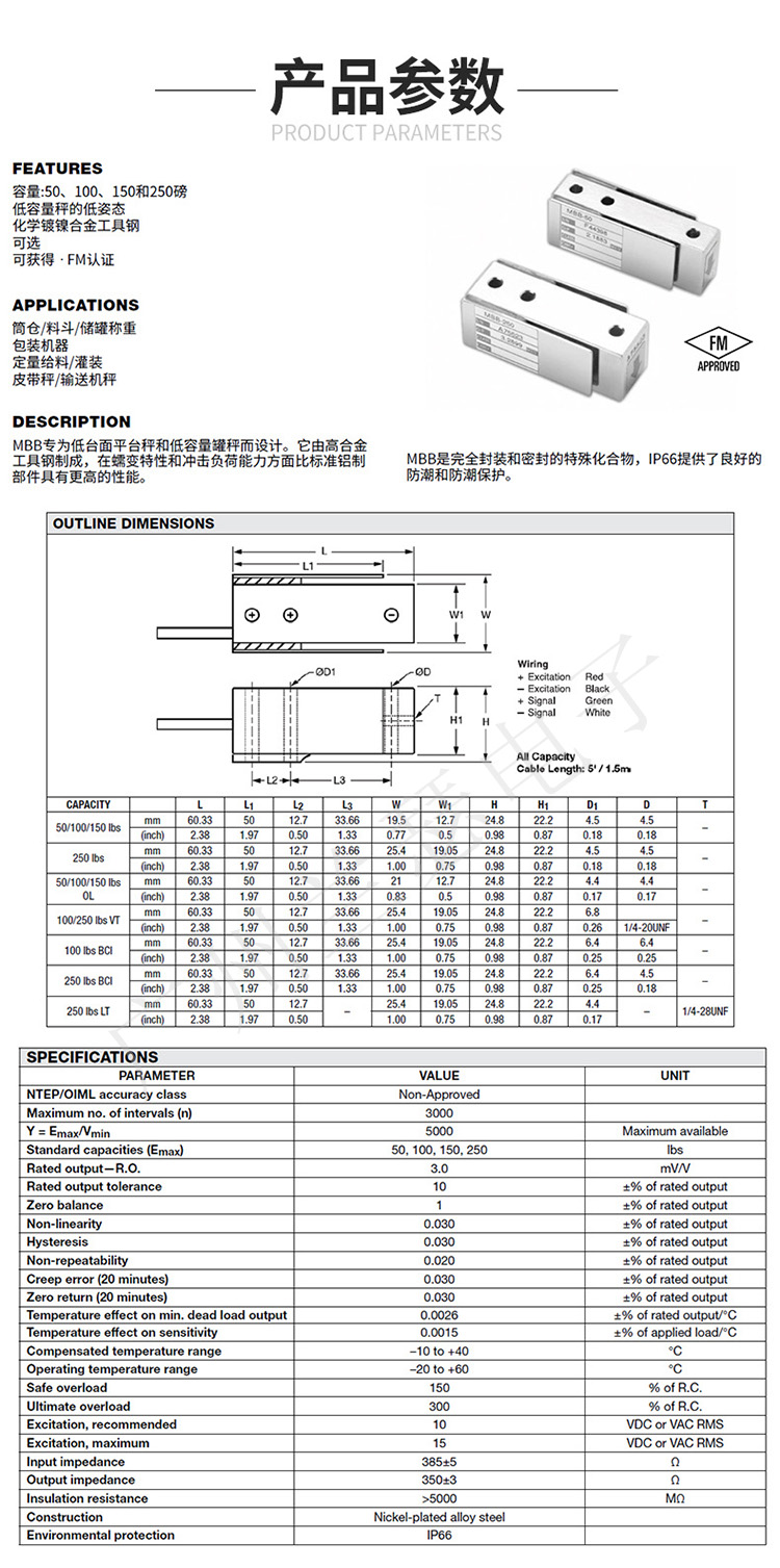 美國Celtron MBB-75kg稱重傳感器產(chǎn)品參數(shù):